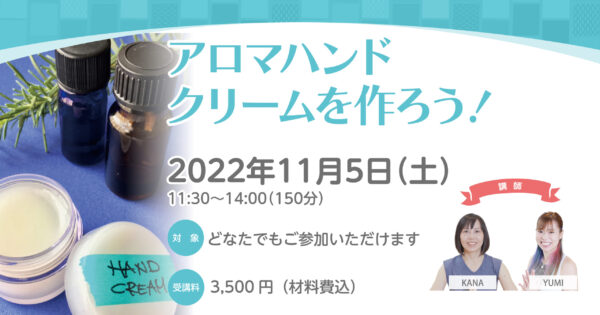 乾燥する今の季節には手放せないハンドクリーム。せっかく使うんだったらお気に入りのアロマをチョイスしてオリジナルのハンドクリームを一緒に作ってみませんか? 余分なものが入っていないのでお肌にやさしく敏感肌の方にもオススメで […]