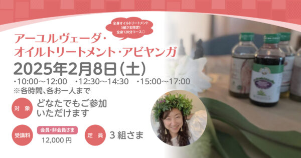 新春企画!お気軽体験!アーユルヴェーダオイルケア・アビャンガ アビャンガは、温ためた薬草オイルをお肌に塗布し「ツボ」を優しく刺激、リンパや気血の流れ促します。血管の詰まりや汚れ、溜まった毒素を流す効果があります。また、3 […]