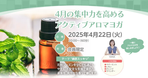 【終了】【会員限定】4月22日(火)★★★集中力を高めるアクティブアロマヨガ~with A YOGA~